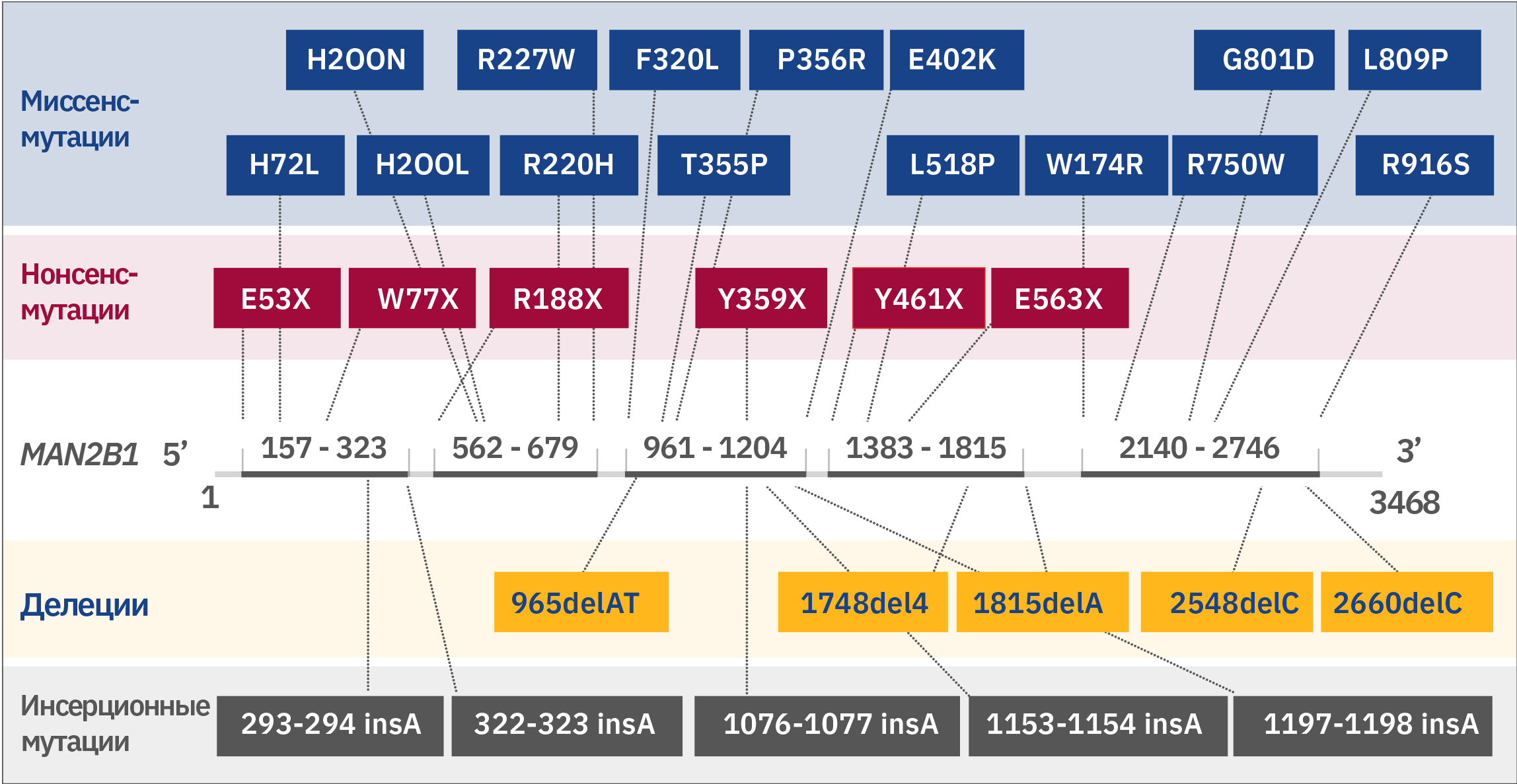 Мутации в гене MAN2B1 приводят к потере активности альфа-маннозидазы в лизосомах 2. В зависимости от характера мутации в MAN2B1 патологически измененный белок MAN2B1 обнаруживается во внутриклеточных компартментах, таких как эндоплазматический ретикулум и лизосомы 2. Например, может быть нарушена конформация белка, и он «застревает» в эндоплазматическом ретикулуме, или конформация белка не нарушается, и он транспортируется в неактивном виде в лизосомы 2. К настоящему времени было выявлено 155 вариантов у 191 пациента, которые были изучены на биохимическом уровне3.